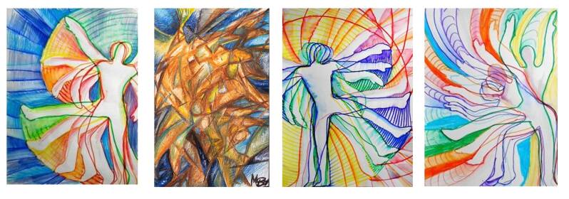 In de plaatjes hier beneden zien je afbeeldingen waar het begrip dynamiek (ook heel belangrijk in de kunststroming van het futurisme) heel duidelijk naar voren komt: door het lijngebruik, door herhaling, door kleur en door de vormen, krijg je een dynamische tekening: er is de suggestie van beweging.