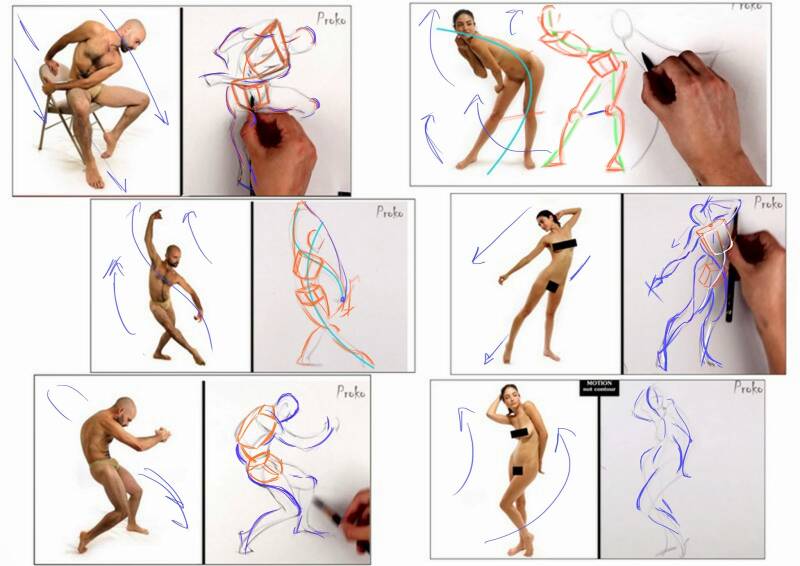Voeg daarna telkens volume toe aan de 'stick' figuurtjes, door ze te vormen met spiermassa en huid. Je krijgt nu dus de omtrekvorm van de bewegende figuren (zie afbeeldingen onderaan deze pagina als voorbeeld).