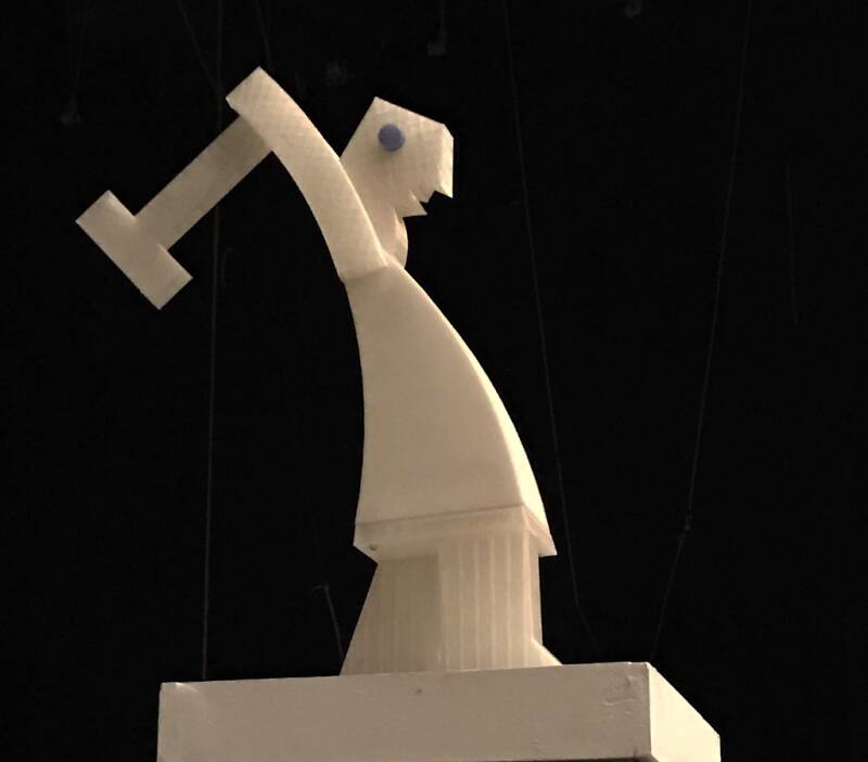 Maak een ruimtelijk beeldje van max 20cm van een dynamische mensfiguur met geassembleerde restmaterialen (ijzer, karton, hout, plastic, draad e.d.) waarbij je het mechanische/machinale van een figuur benadrukt.