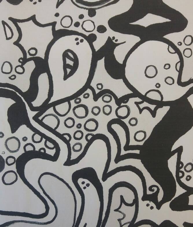 - maak een variatie in vlak, lijndikte en vorm zodat er een speels patroon ontstaat, gebruik ook organische vormen