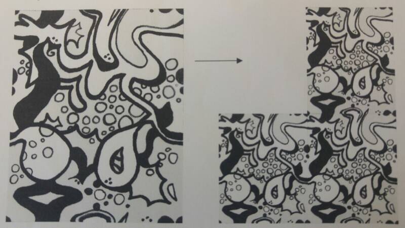 Check of het patroon klopt en dat je het door kan leggen. Maak een foto van je patroon dat je voortdurend herhaalt (ongeveer 3x3 cm), bijvoorbeeld door kopiëren, of door een fotootje in Word, en dan uit te printen. Dit printje gebruik je in je werkstuk door het op de juiste manier te knippen en op de muren te plakken in je tekening.