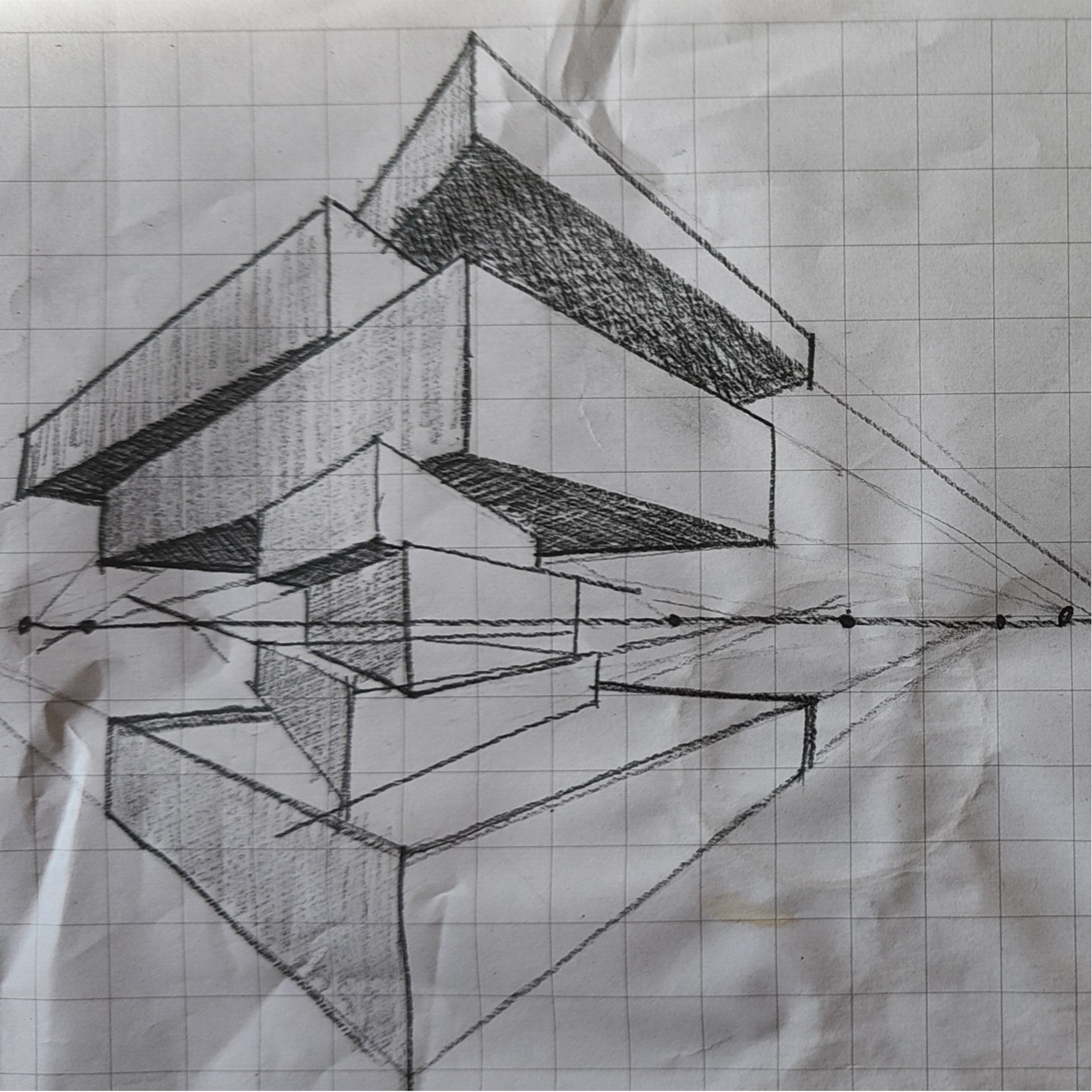 2. Zet als tweede daarna (lucifer)doosjes scheef op elkaar, die je dan ook tekent in perspectief. Let op! Deze twee gestapelde doosjes hebben dus beide eigen verdwijnpunten op dezelfde(!) horizon!