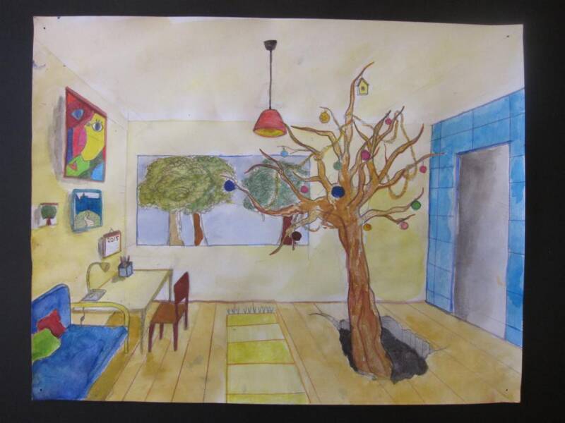 Teken op een blad van 50x65 een mooie kamer (en dingen die erin staan) in een één- of twee-puntsperspectief, kantlijn van 2 cm. Maak je eigen ontwerp, teken dus niet een tekening na!
